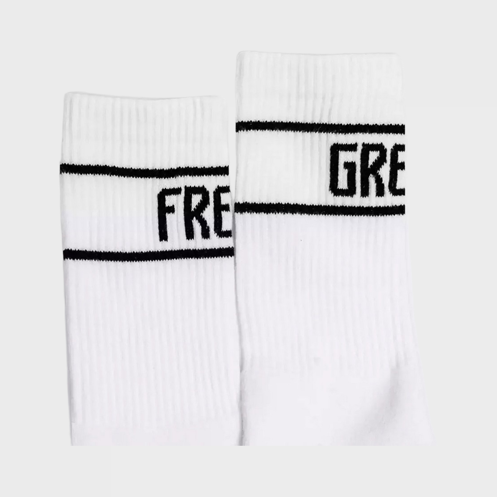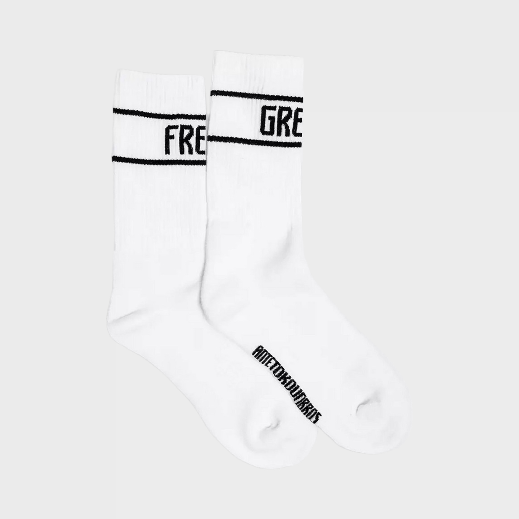 - Λευκές ριμπ κάλτσες με υφαντό κείμενο “Greek Freak”